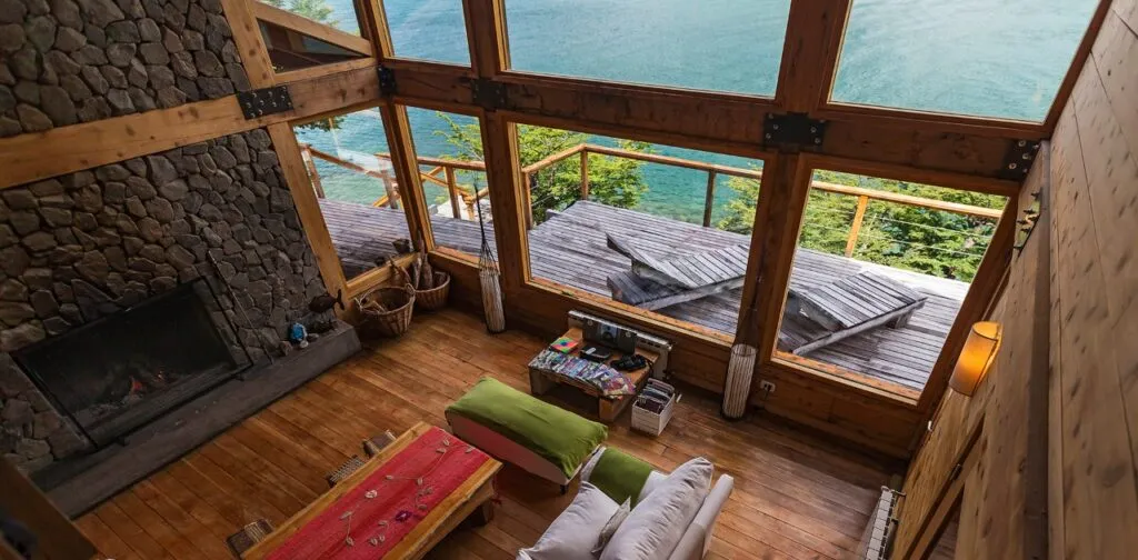 The rustic five-suite lodge is comfortable and cosy, and wide windows offer breathtaking views over the lake to hanging glaciers and woodland. Choose the corner rooms for stunning views of Mt. Fitz Roy.