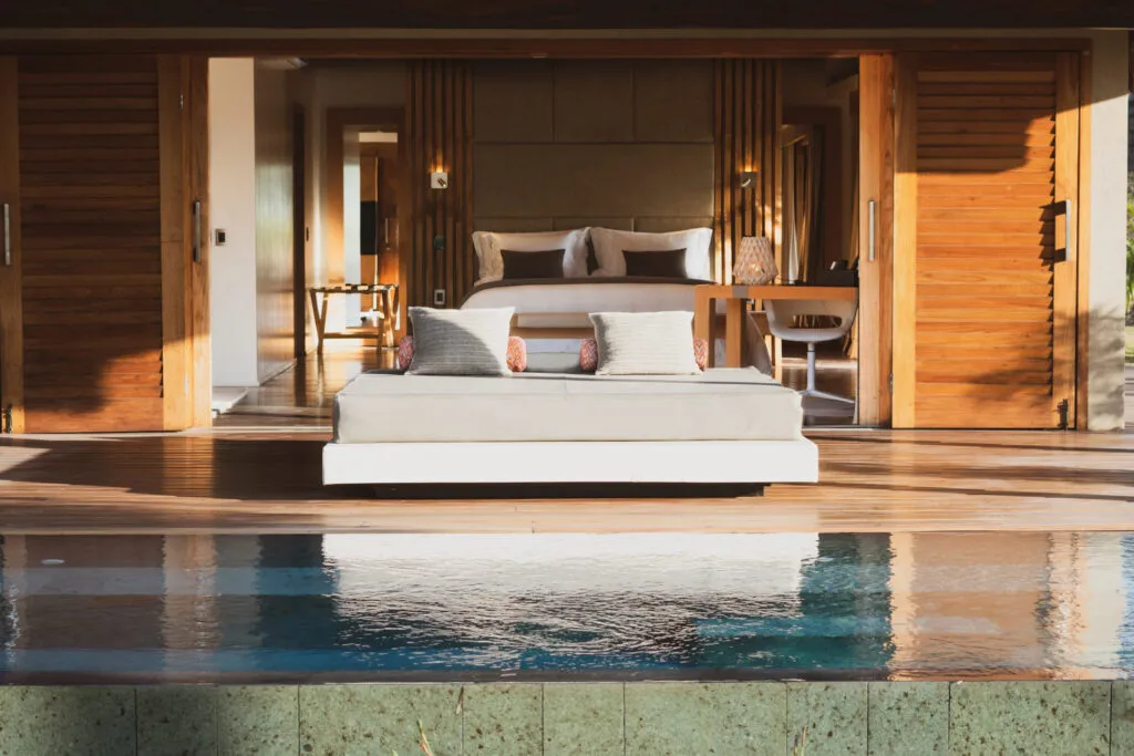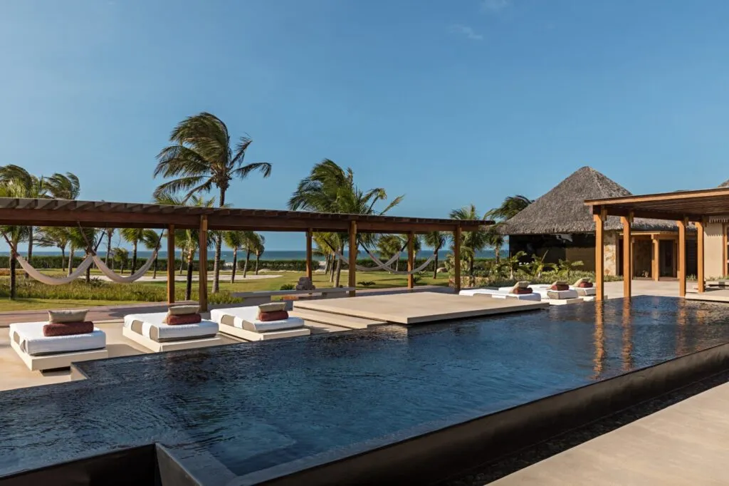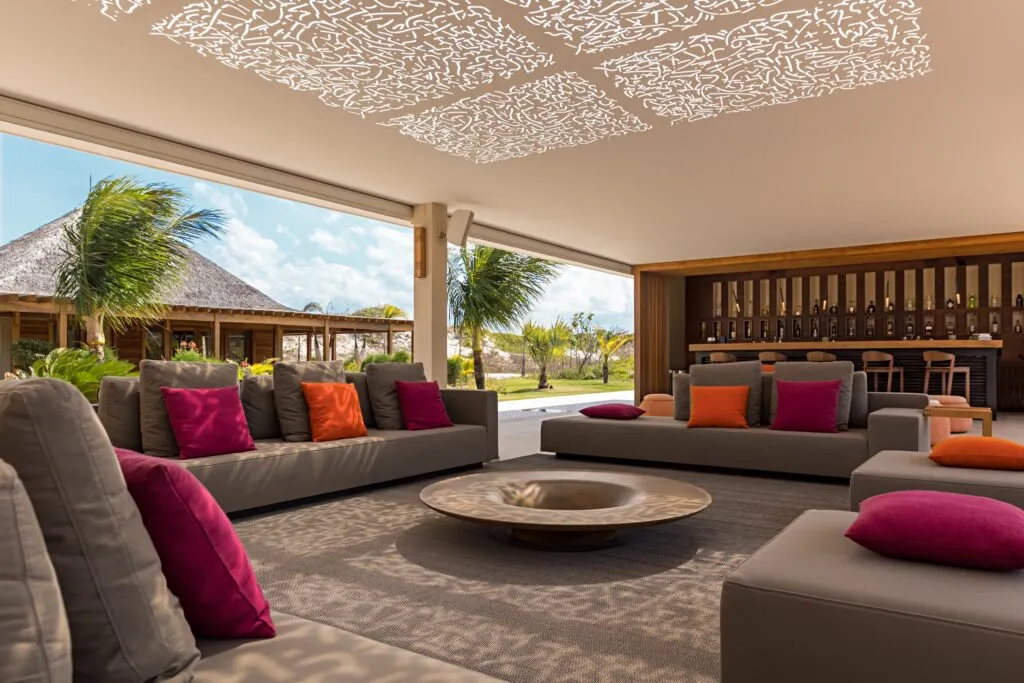 Nine sleek bungalows stand between white dunes and sparkling lagoons, with thatched roofs, ultra-contemporary open-air living spaces, and an infinity pool positioned towards the sea.