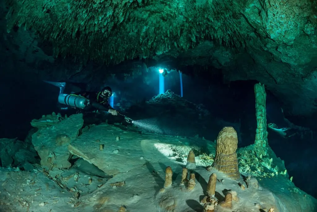 You’ll experience scuba diving paradise on a journey through the Tajma Ha Cenote. The beautiful effect of sunshine streaming through small tunnels sending light into the caverns is mesmerising; it casts spectacular shadows across the fields of stalactites and stalagmites lining the walls, making for an eerily beautiful cave diving experience.