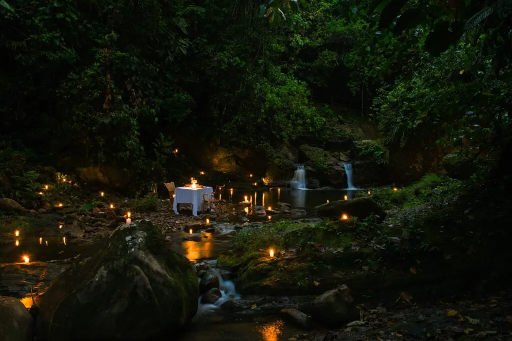 Finally, we ended in the forest, reconnecting with nature. We organised a silent dinner there, facing an ancient, sacred tree, and we added hundreds of candles. The purpose was to have a whole day of purification and temazcal and massage, then to finish by dining in silence – to reconnect, to feel the power of nature, and to thank that sacred tree for protecting us.