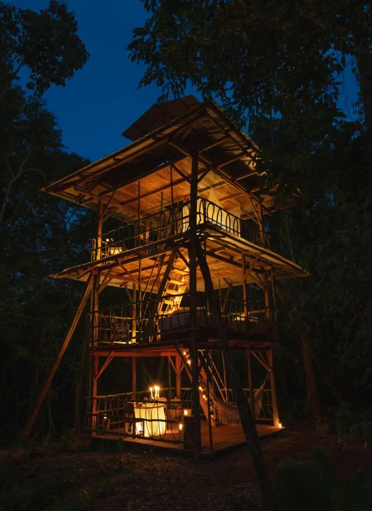 We reduced 12 rooms to 3 suites, built a lounge platform, turned the restaurant into a forest lab, and created an observatory in the middle of the forest to spend a night in jaguar territory. We also supported their regenerative projects, including a paper factory, a cacao plantation and Melipona honey production.