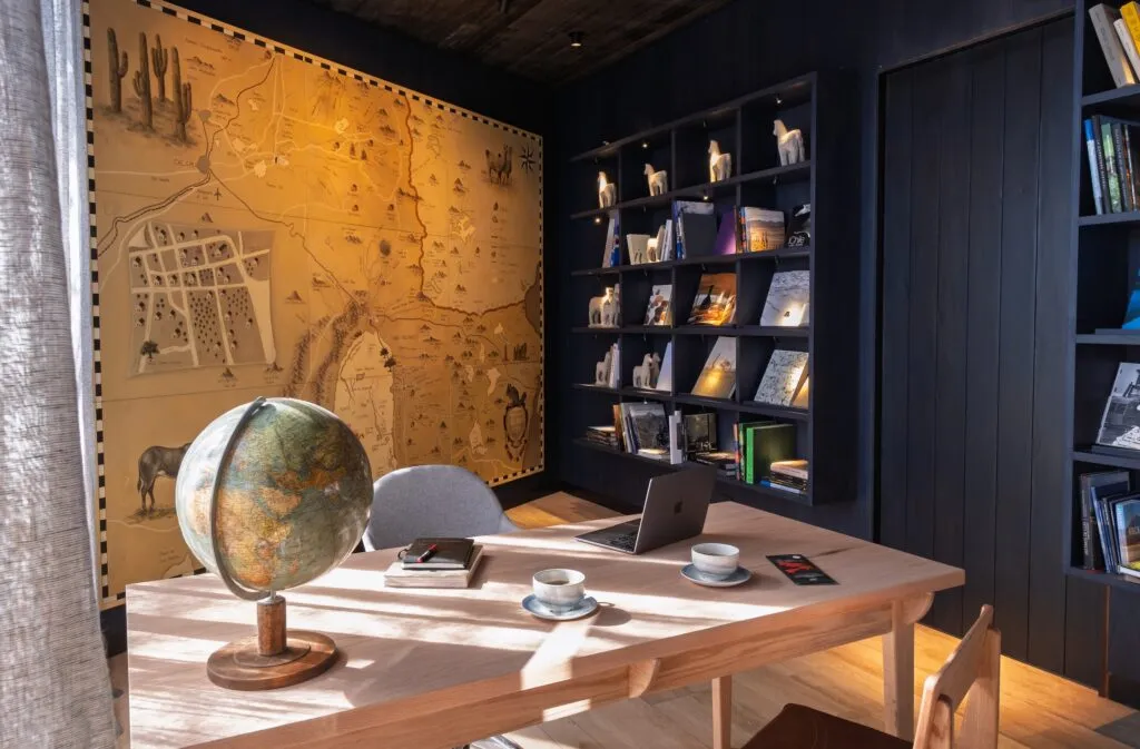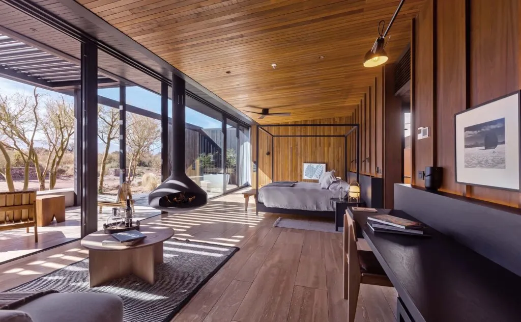 - The sleek contemporary design, with chic wood and leather furnishings, locally-sourced white marble, handwoven Chilean textiles, and contemporary art by over 40 local artists.
